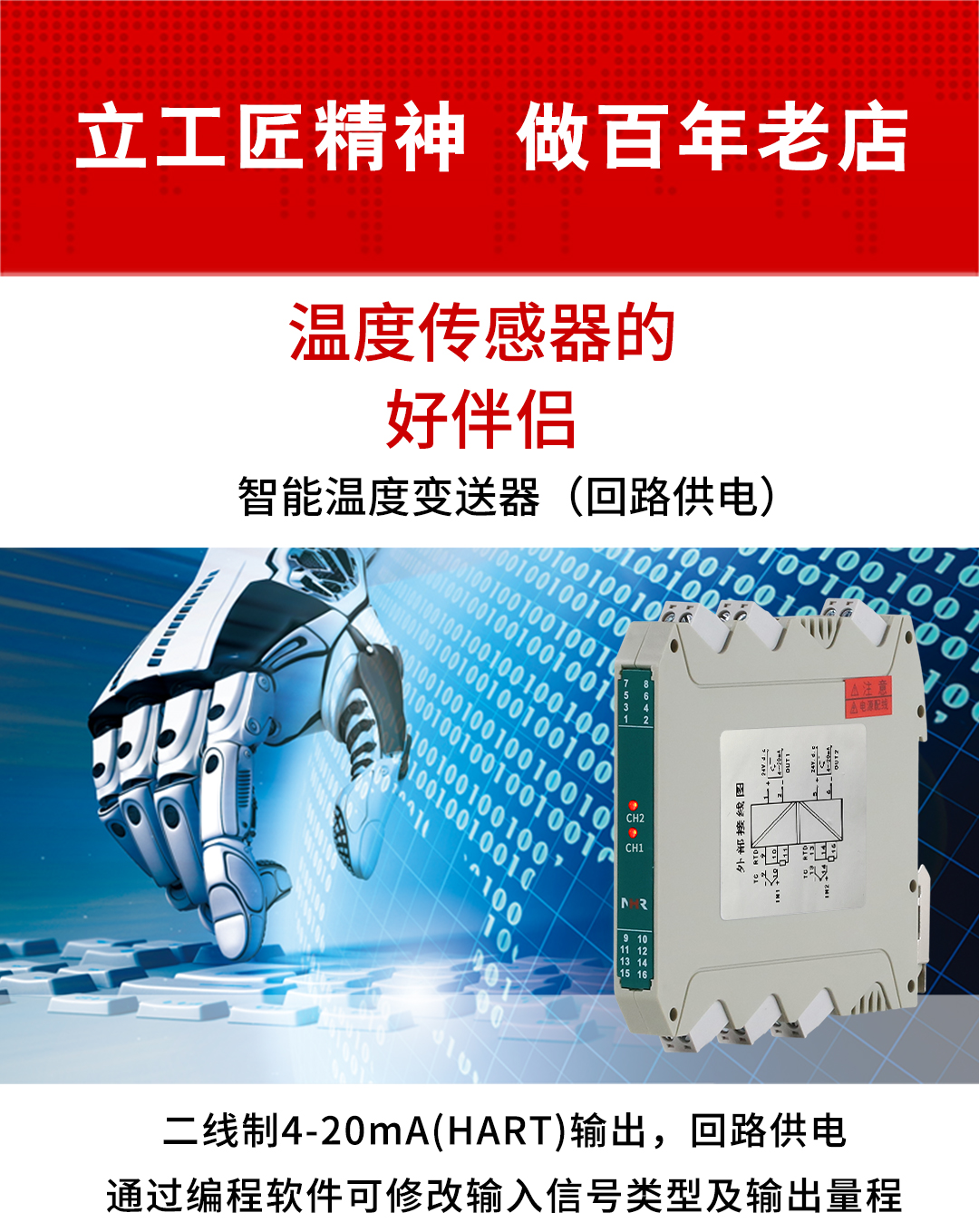 虹潤(rùn)公司是專(zhuān)業(yè)生產(chǎn)溫度變送器的國(guó)家專(zhuān)精特新“小巨人”企業(yè)。生產(chǎn)的HART智能溫度變送器,具有適配各類(lèi)溫度傳感器,通過(guò)編程線(xiàn)修改輸入信號(hào)類(lèi)型及量程,二線(xiàn)制4-20Ma(HART)輸出,回路供電等特點(diǎn)。該產(chǎn)品不僅通過(guò)HART基金會(huì)認(rèn)證、德國(guó)萊茵 CE 認(rèn)證與 SIL 功能安全認(rèn)證,還獲得具備減震抗干擾能力的溫度變送器、信號(hào)隔離器、一種二端子模塊、無(wú)源信號(hào)隔離器等4項(xiàng)國(guó)家發(fā)明專(zhuān)利,主持起草物聯(lián)網(wǎng)智能溫度儀表、現(xiàn)場(chǎng)設(shè)備工具(FDT)接口規(guī)范、工業(yè)過(guò)程測(cè)量和控制系統(tǒng)用溫度變送器等3項(xiàng)國(guó)家標(biāo)準(zhǔn),以及通信系統(tǒng)多通道數(shù)據(jù)采集控制終端規(guī)范軍用標(biāo)準(zhǔn),參與國(guó)際5G標(biāo)準(zhǔn)制定,取得HART溫度變送器、智能溫度變送器等5項(xiàng)相關(guān)軟件著作權(quán)。產(chǎn)品廣泛應(yīng)用于石油、化工、電力、冶金、制藥、食品、水處理等各種工業(yè)領(lǐng)域。